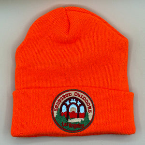 A U.S.-made cuffed beanie anchored by our Launch Edition patch, stitched with coastal precision. The emblem carries the gothic triple-arch—three in one—rising above a valley of trees, meadow lines, and distant ridges. Small in size, long in symbolism. Built for wind, road, and the quiet rituals of cold mornings and colder evenings.